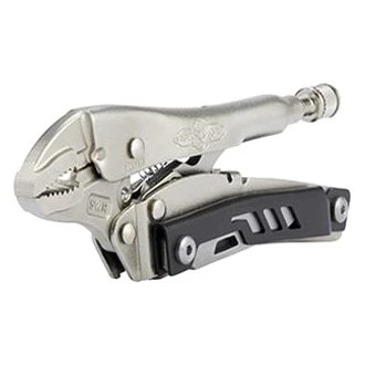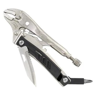 Vise-Grip™ 5″ Metal Handle Curved Jaws Multi Tool Locking Pliers by IRWIN®. With 5″ Wire Cutter. The new IRWIN™ VISE-GRIP™ 5″ Curved Jaw Locking Multi-Pliers with Wire Cutter feature the legendary locking pliers performance tradesmen have trusted since 1924. The 5WR™ Locking Multi-Pliers feature a fold-out stainless steel serrated knife blade and a fold-out stainless steel serrated knife bland and a fold-out screwdriver including a 1/4″ bit holder with 6-8 slotted and #2 Phillips™ bits. The four-tools-in-one design allows users to to carry fewer tools on the job.