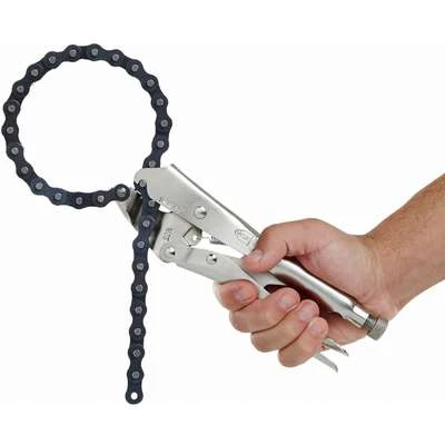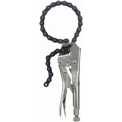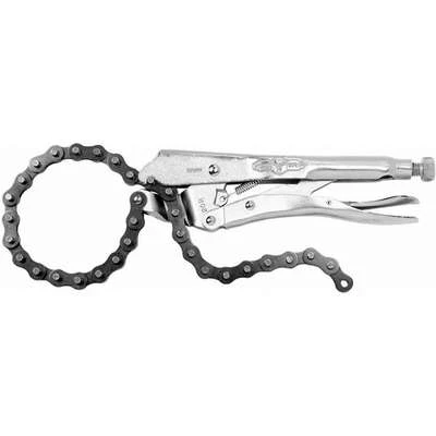 The IRWIN® VISE-GRIP® locking chain clamp holds and locks around any size or shape. Won’t slip or crush thin-walled pipe. Adjusts in either direction. Nickel-plated, heat-treated alloy steel clamp has micro-adjustment screw mechanism.